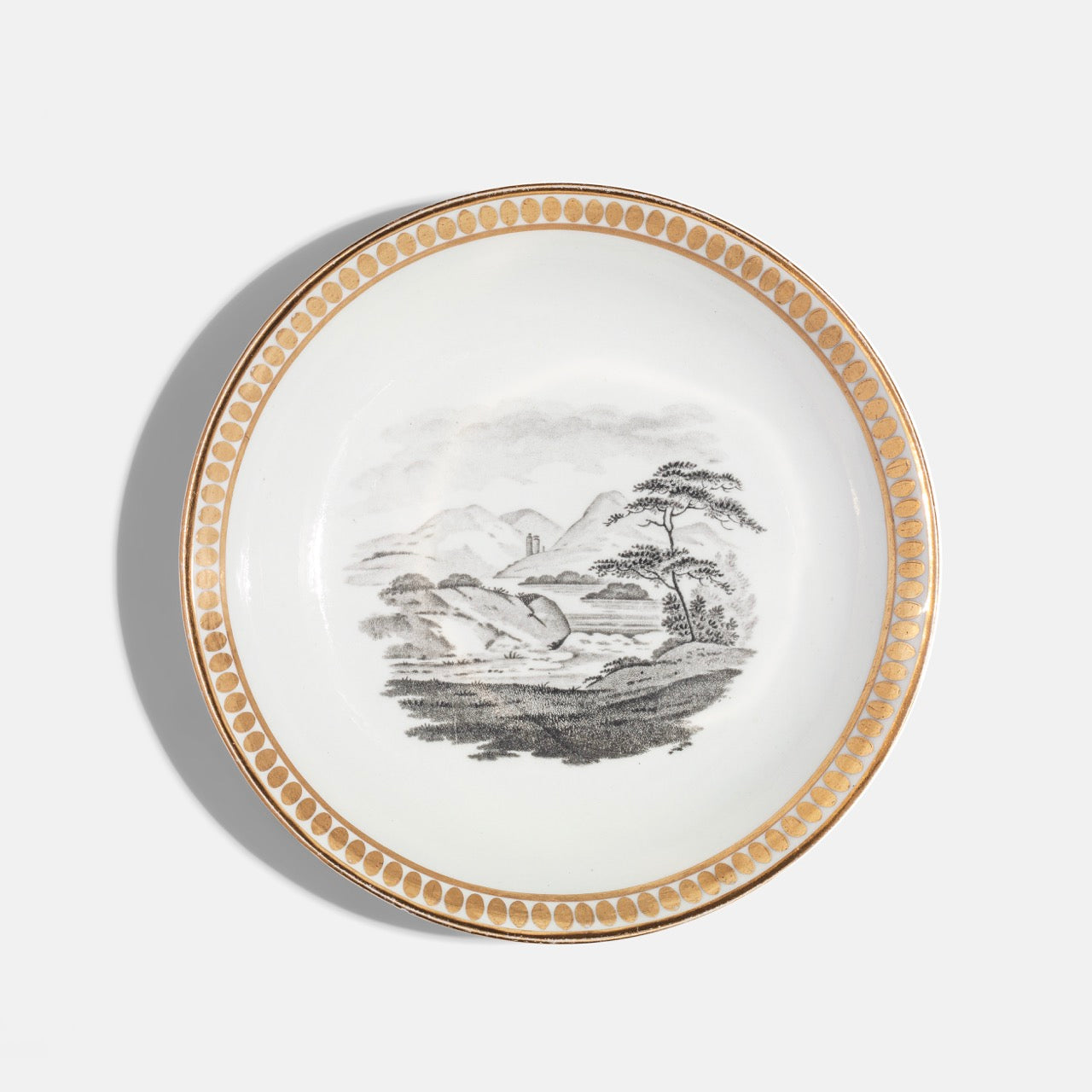 This highly unusual saucer is a real one-off. With a delicate, deep rolling landscape in greyscale and a strong geometric gold hand-painted border, this is a rare find which will draw you into a moment of serene beauty captured in the early 19th century.