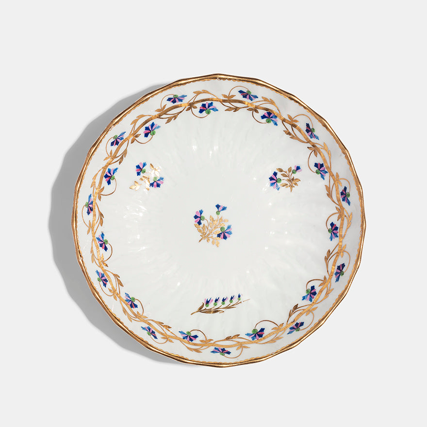 A special collection of four saucers in exquisite condition. A deeply creative pattern, generously painted in five different colours shows winding tendrils of small but beautiful flowers. The decoration doesn’t end with the pattern, as the body of the saucer itself has been moulded with a delicate and textural starburst pattern emanating from the well. Some of the earliest saucers we have, these pieces were created during the reign of George III, around 100 years before the introduction of electricity in England.