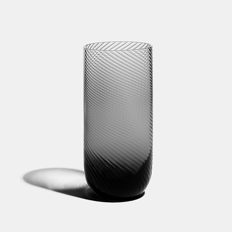 Available in a sultry charcoal hue that catches the light and offers a point of intrigue. The smoky colour emanates from the base of the glass, creating a smooth gradient as it spirals upwards.